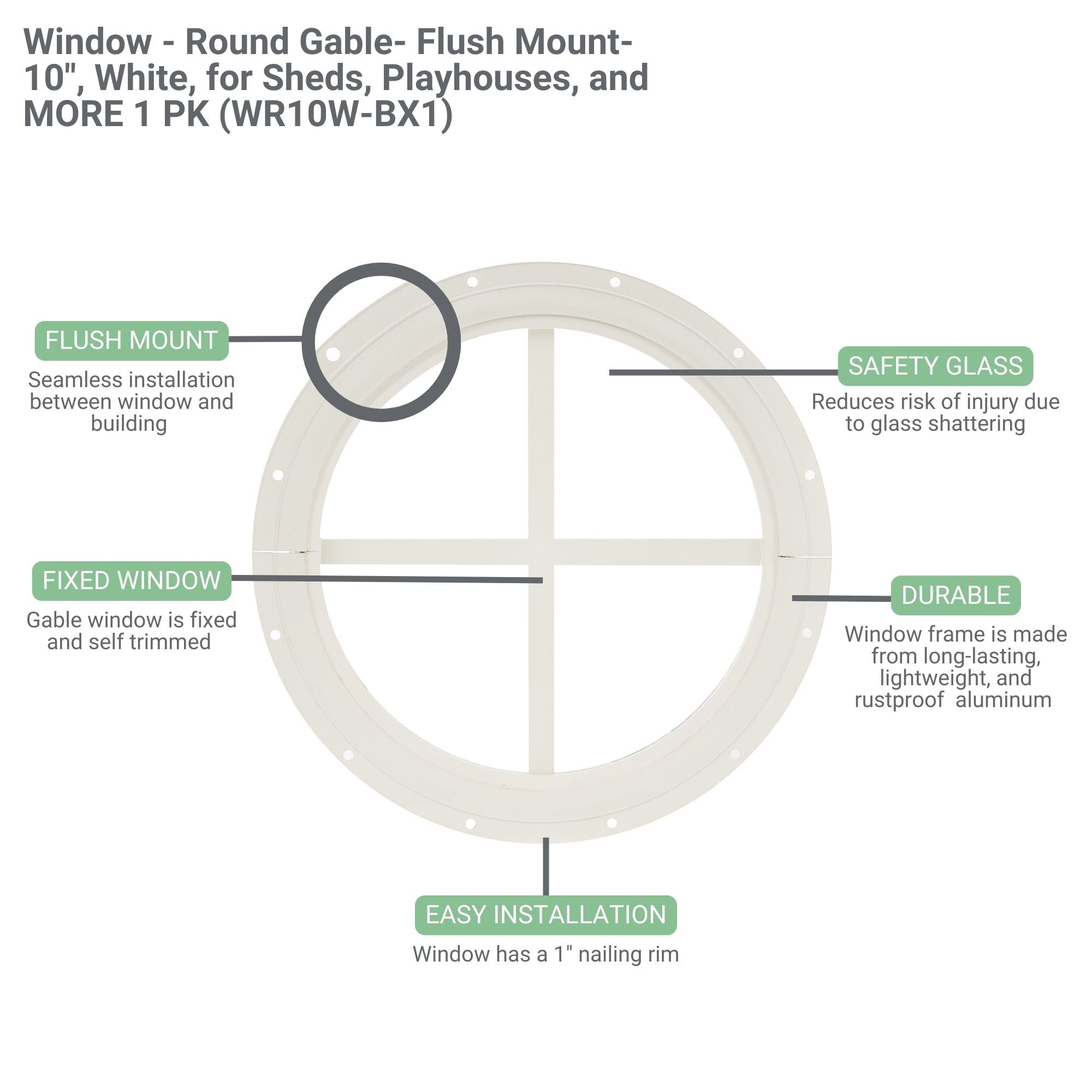 Add a unique touch to your playhouse or shed with this 10" round gable window! A compact and stylish accent, it’s built tough and installs easily.