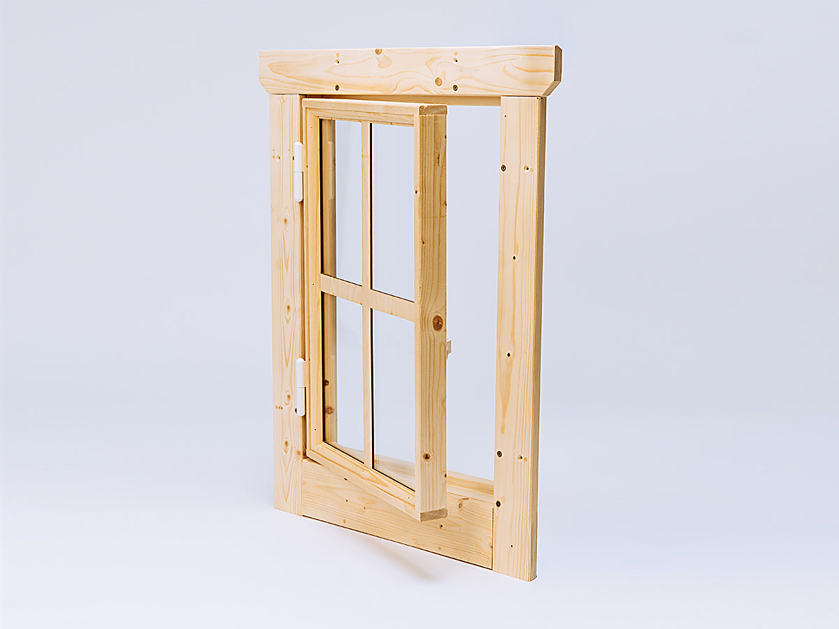 Hand made from solid Nordic Spruce, this fully operable playhouse window includes a matching frame and durable metal hinges. For better long-term light transmission, laminated safety glass is used instead of plastic.